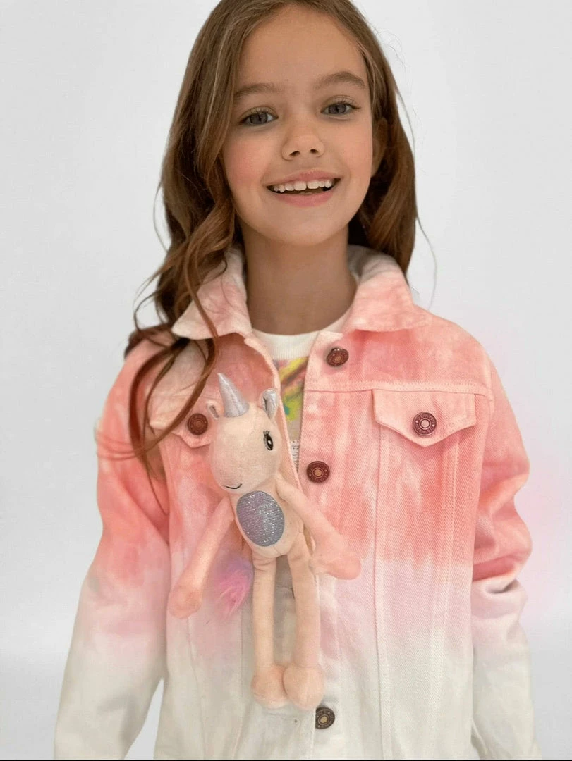 Dip dyed pink and white denim jacket with a 3D unicorn stuffed animal encrusted in crystal attached on the chest!