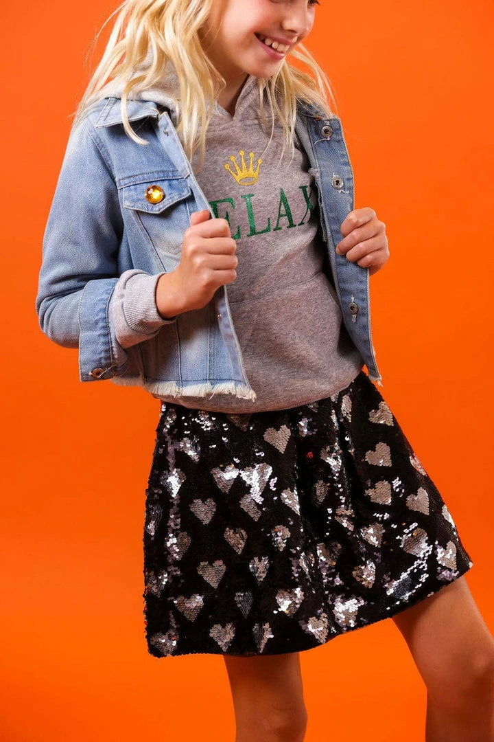 Black fully sequined skirt with white hearts and elastic waistband!ย