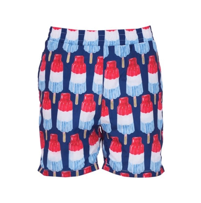 Adorable boys swim shorts with printed red, white and blue popsicles!
