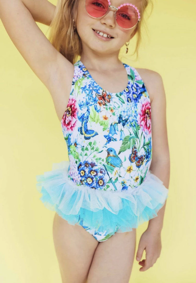 White and floral printed one piece with blue tulle and bird accents! Comes with a matching swim cap.ย