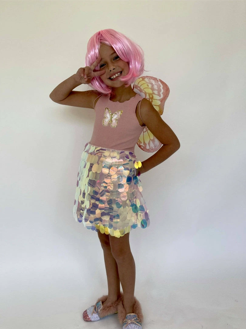 Sleeveless paillette pink dress with butterfly sequin patch!ย