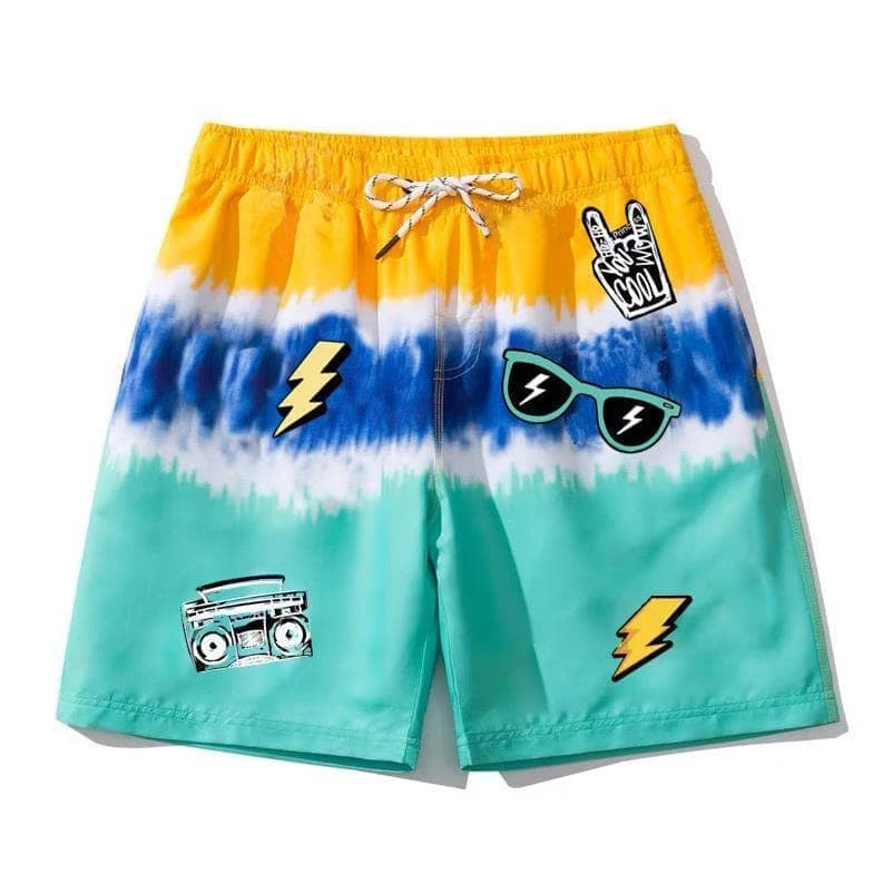 Royal blue, turquoise, and yellow tie dye swim trunks with summer themed patches!ย