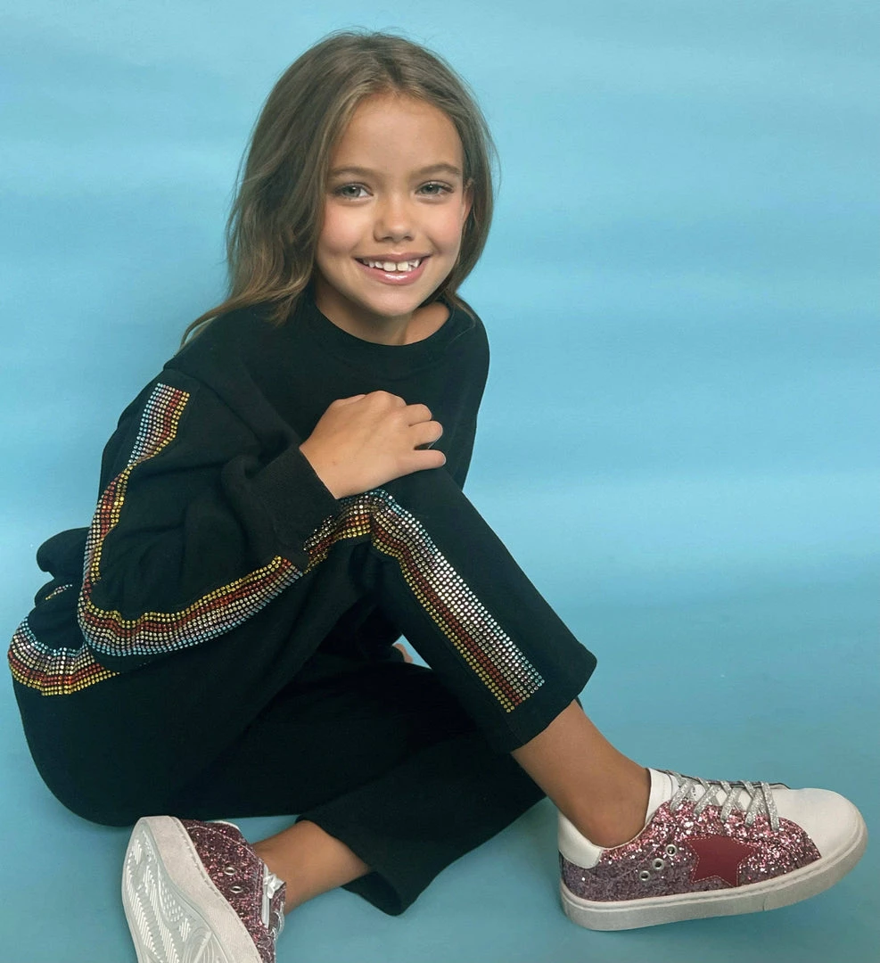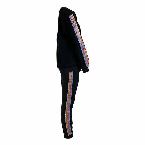 The coziest black crewneck and sweat pant set with metallic rainbow stipe down the arms and legs!Β