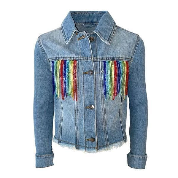 Medium wash denim with rainbow crystal tassels all the way around it!ย