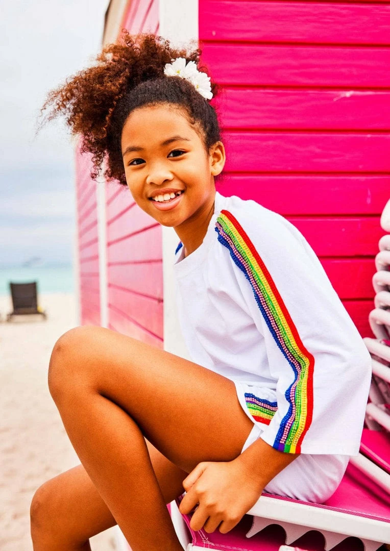 If you are looking for a sporty outfit, here’s the perfect one for you! A matching sporty set in white with beautiful crystal rainbow details make this sporty and funย