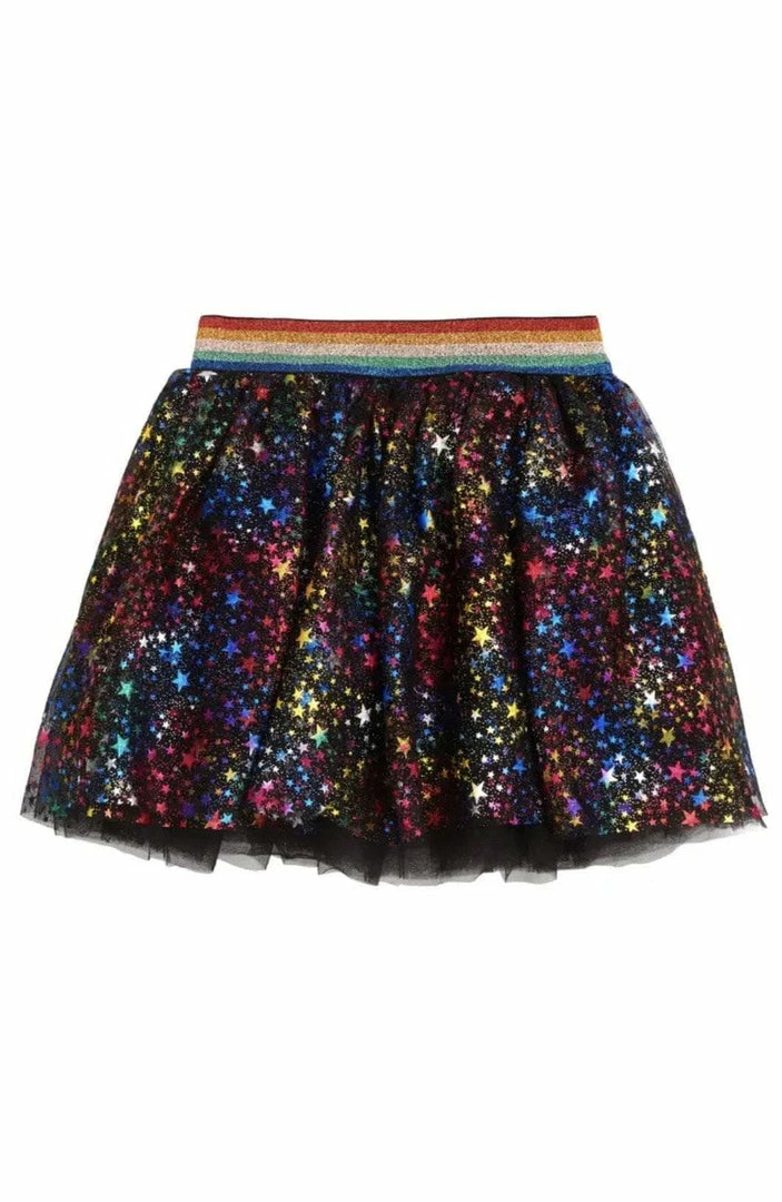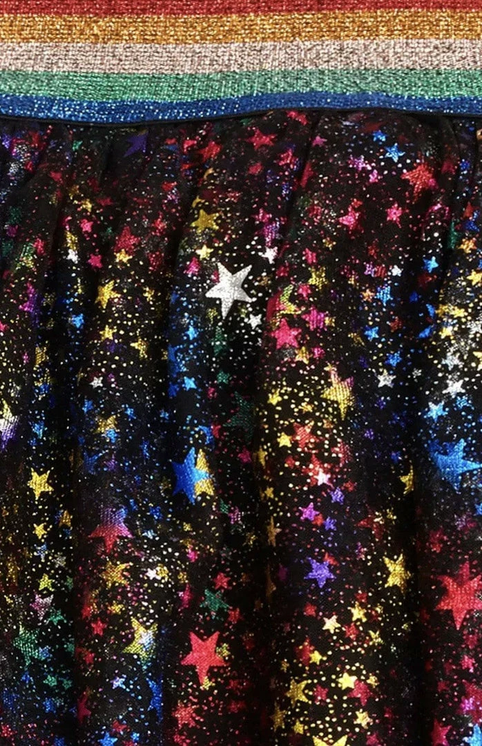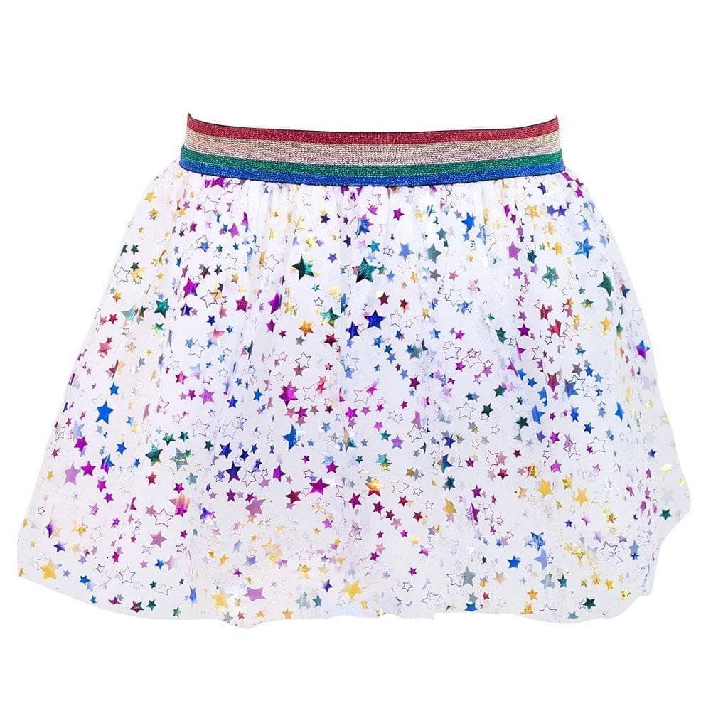 Girls rainbow foil stars decorate this cute tutu with a rainbow elastic waistband with multiple color options.
