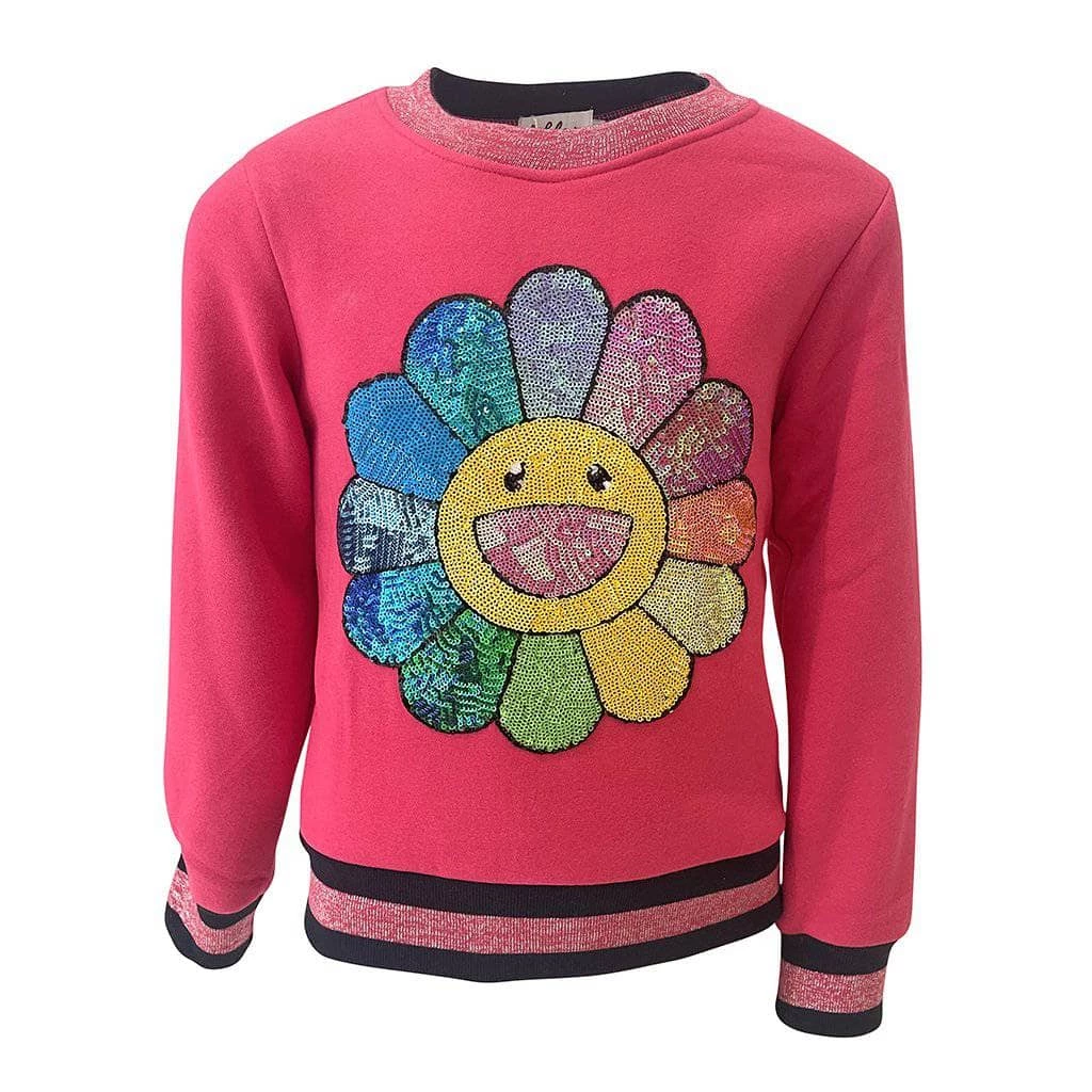 Peachy pink plush and soft crew neck with sequin flower smiley patch!ย