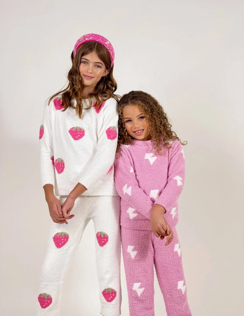 The warm, delicious, and cozy new white fuzzy set with glorious bright pink strawberries!