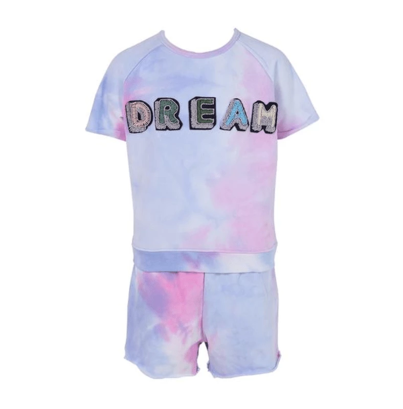 This tie dye track set features beautifully beaded patches and blue/purple hues!
