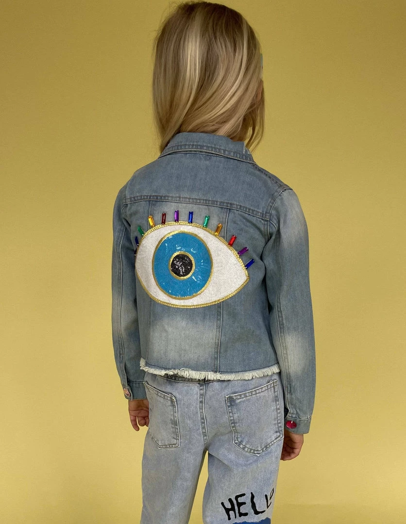 Light wash denim jacket with gem buttons, pocket, and cuff embellishments with a rainbow evil eye gem patch on the back!