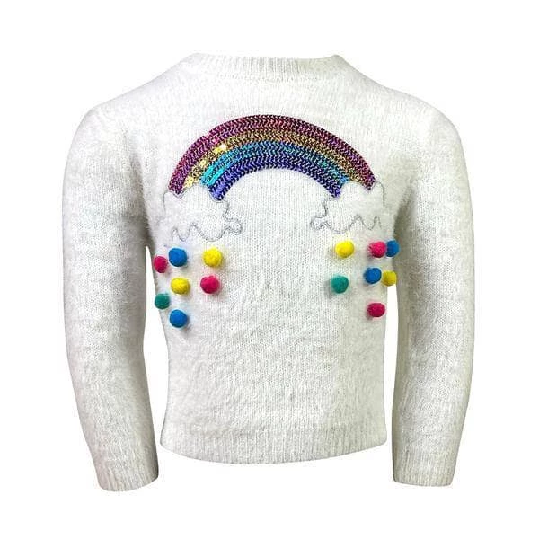 White super fuzzy crew neck sweater with sequin rainbow patch and pom pom rain drops!ย