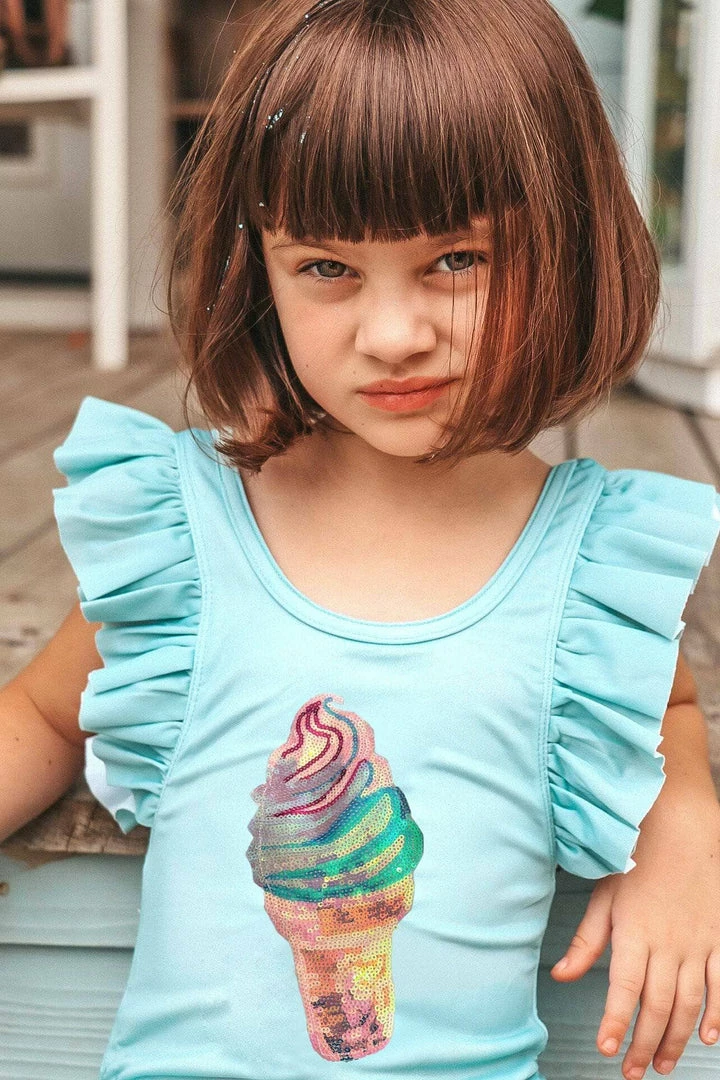 Cute ruffle trim on the shoulders and legs make this sequin ice cream suit the sweet for winter vacations and summer fun!
