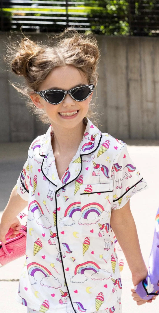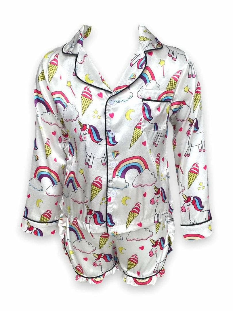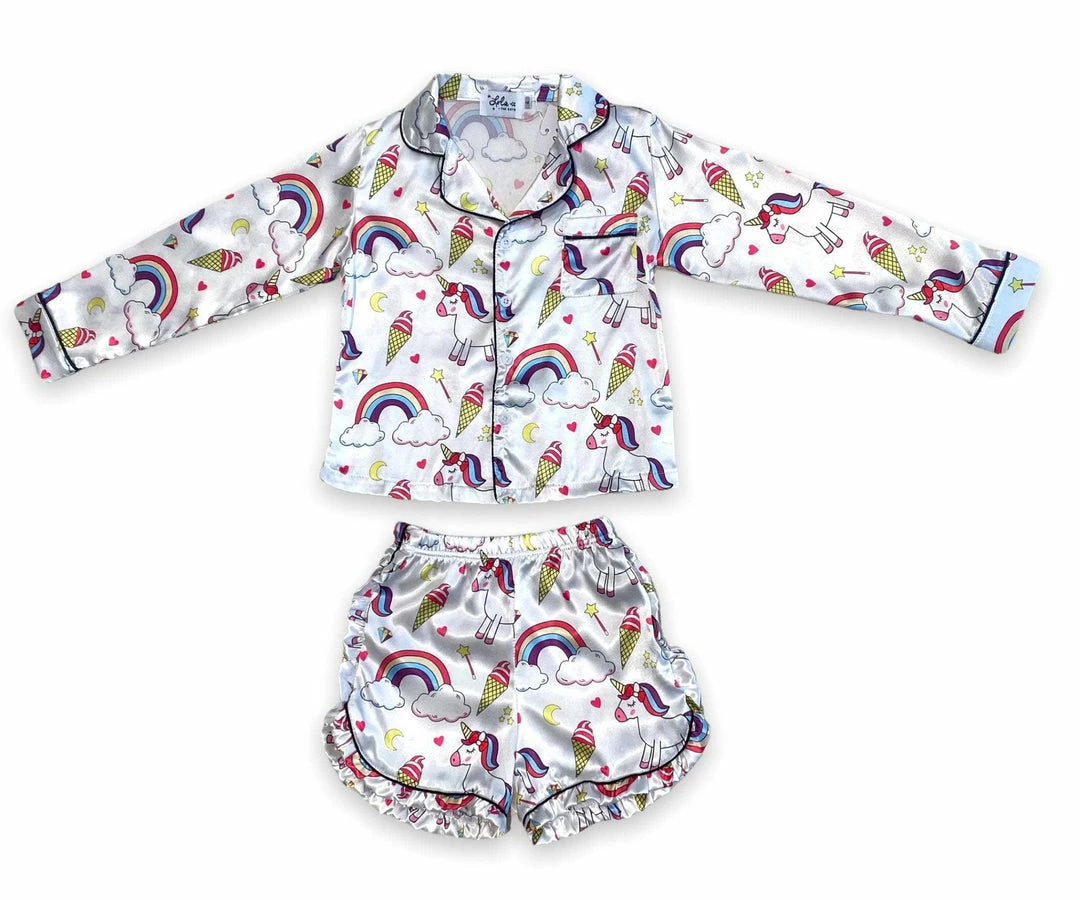 This silk set has unicorns and ice cream designs scattered all over. We love this print !