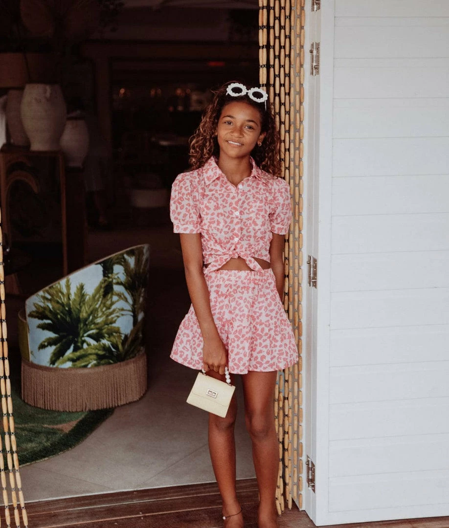 Pink leopard-print soft cotton 3-piece set with button-up shirt with a tie and matching skirt.