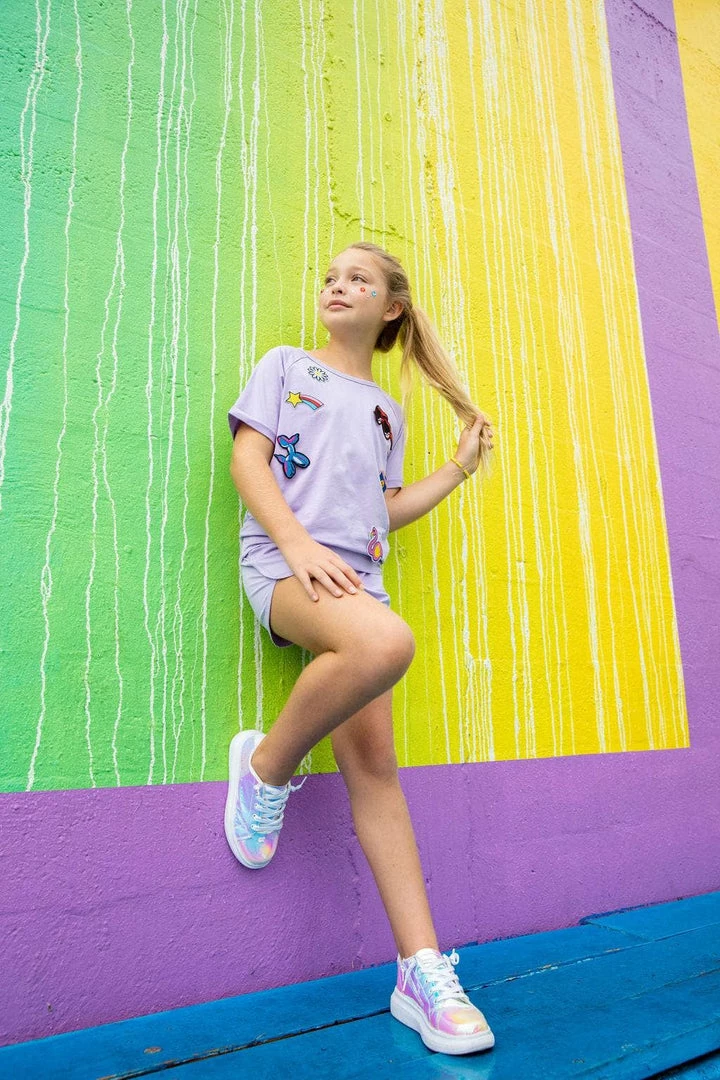 Minimalist matching set with assorted pop star patches embellished all over the shirt.
