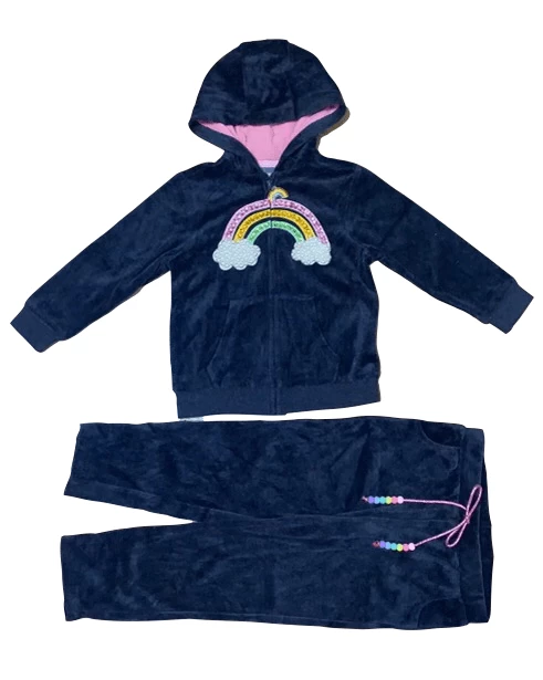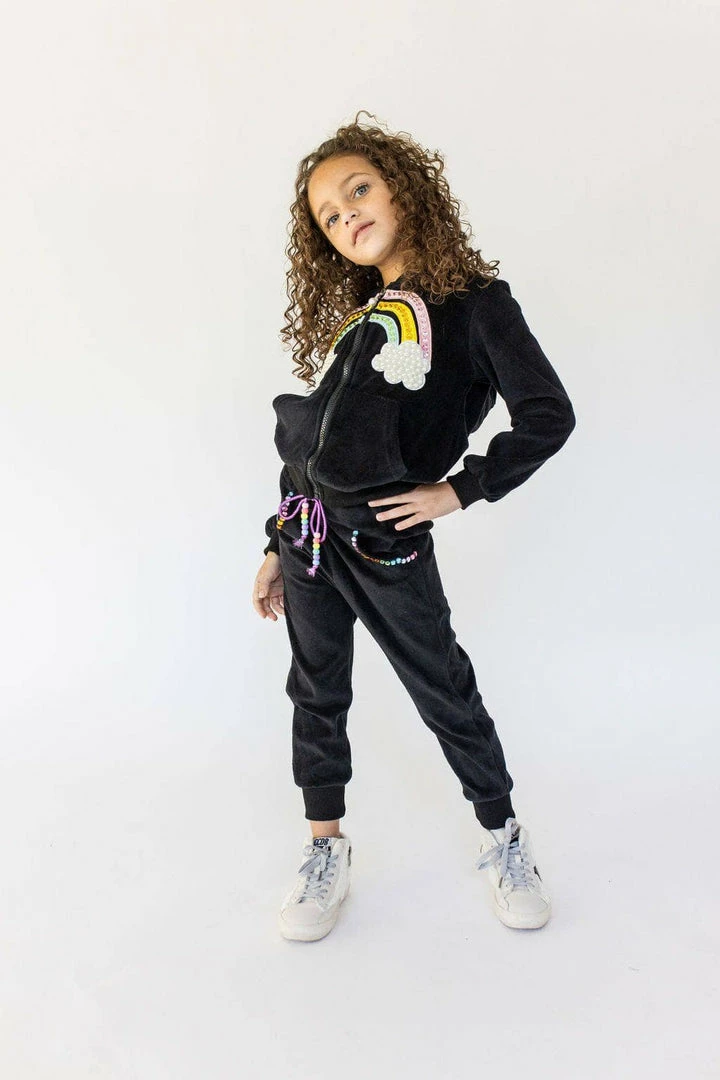 Navy velvet jacket and jogger set with beaded drawstrings and beaded and pearl rainbow patch!ย