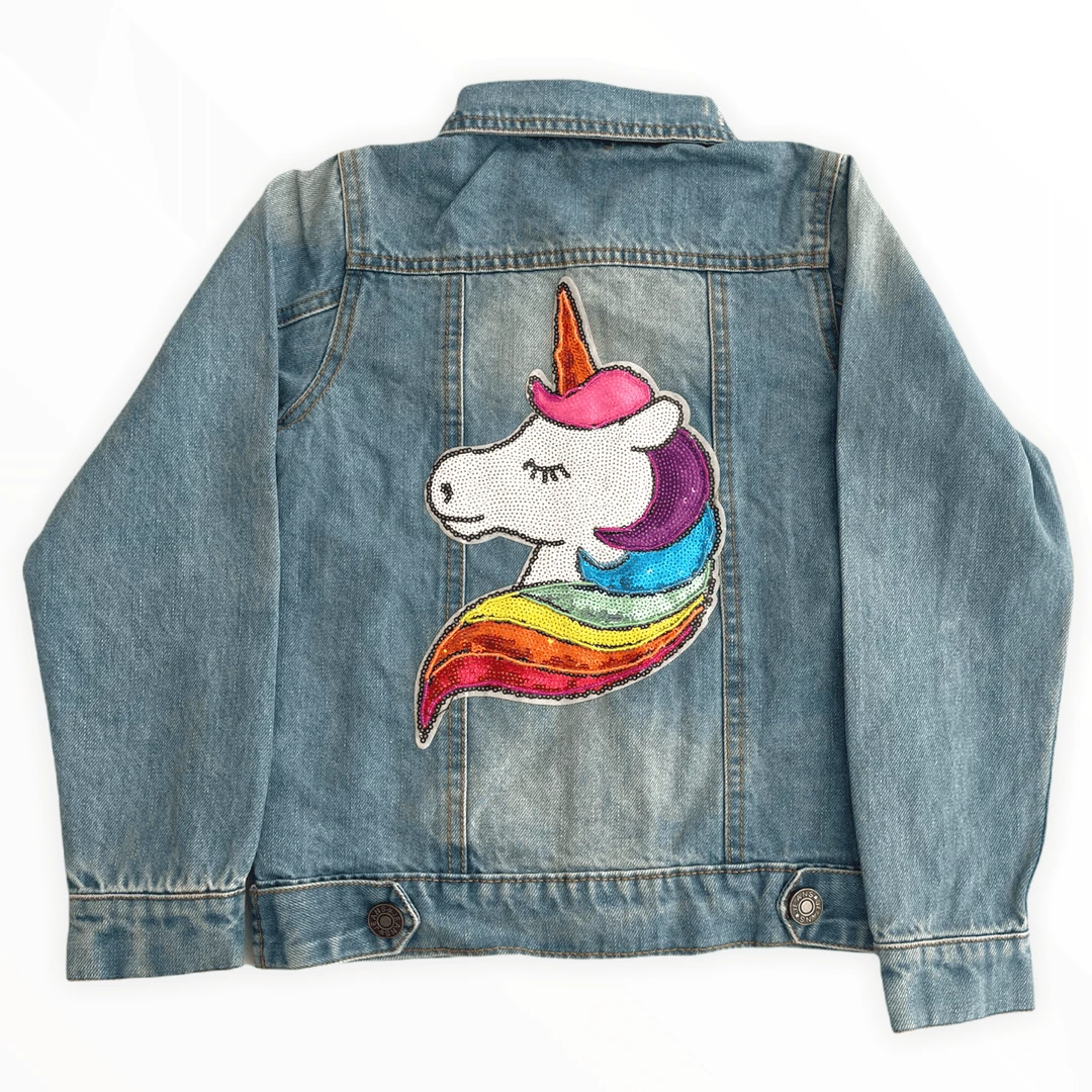 Light wash denim jacket with rainbow beaded trim along the sequin rainbow unicorn patch!Β