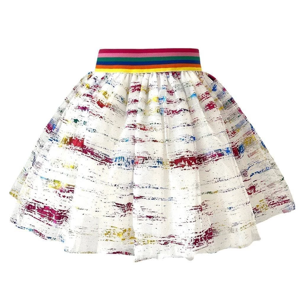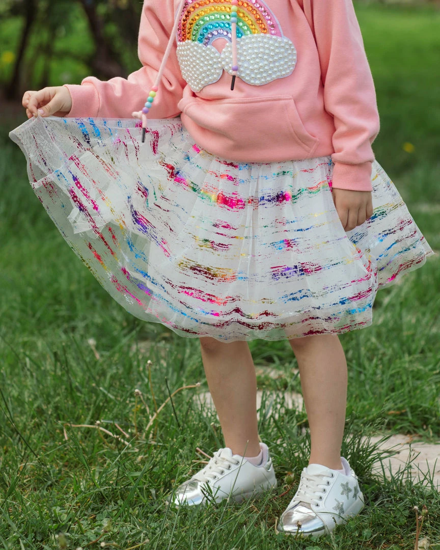 White tutu with neon rainbow waistband and foiled rainbow flakes!ย