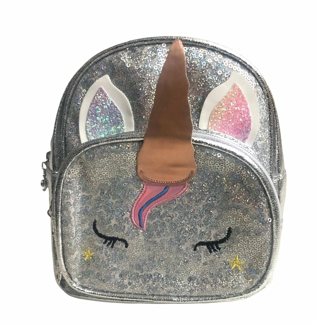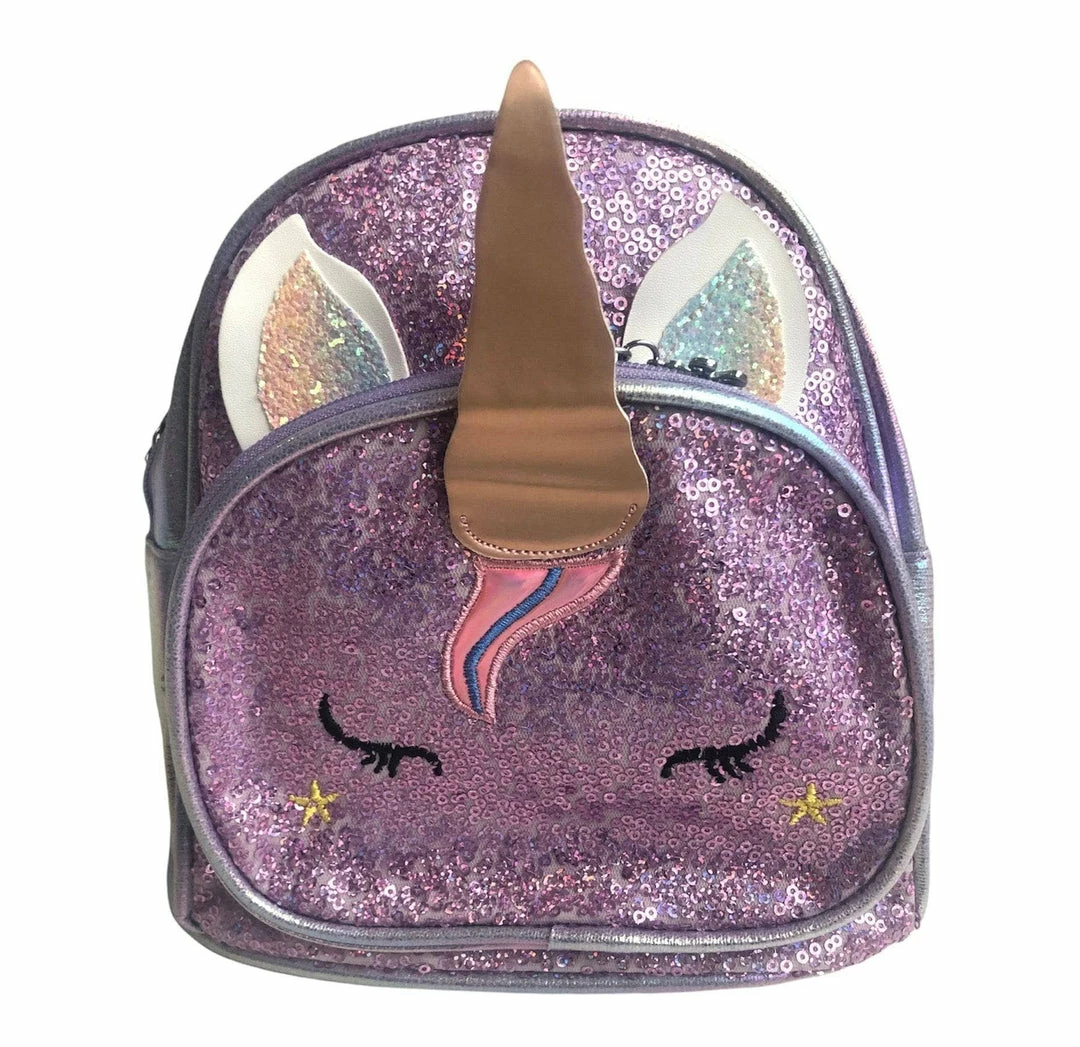 A metallic colorfull sequin sleepy unicorn mini backpack