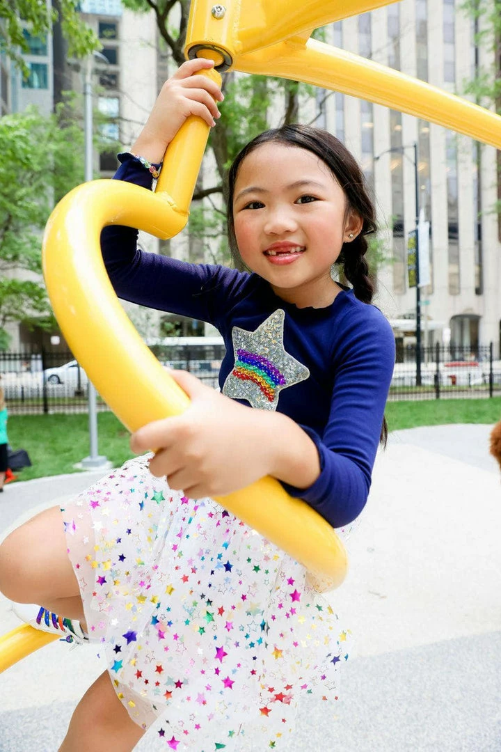 Navy long sleeve dress with sequinย star patch adorned with rainbow gems with a metallic starry tutu skirt.