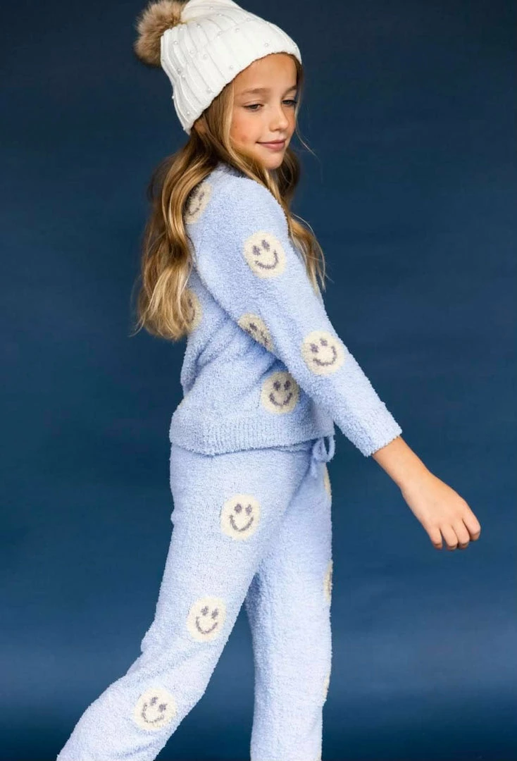 Super soft and plush baby blue crewneck and pant set covered in yellow smiley faces!Β