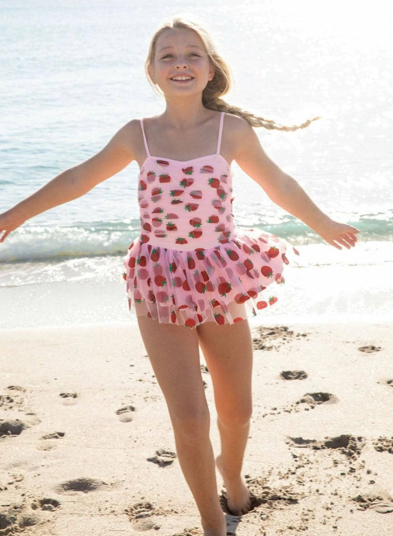 This cute swimsuit is perfect for your little girl to wear to the pool or beach. The pink strawberry tulle swimsuit comes with a matching headband. This is a great gift idea for your daughter, niece, granddaughter or any special girl in your life!