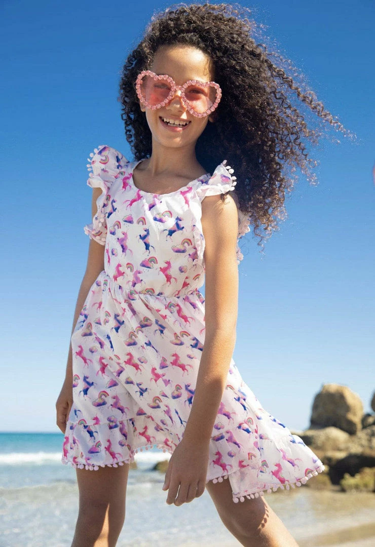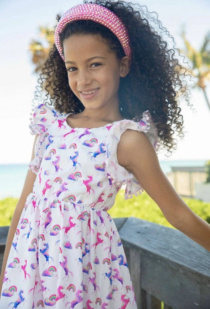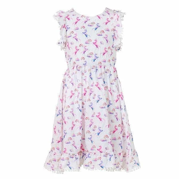 The cutest white ruffle shoulder dress covered in unicorns and rainbows! Super light weight linen material.ย