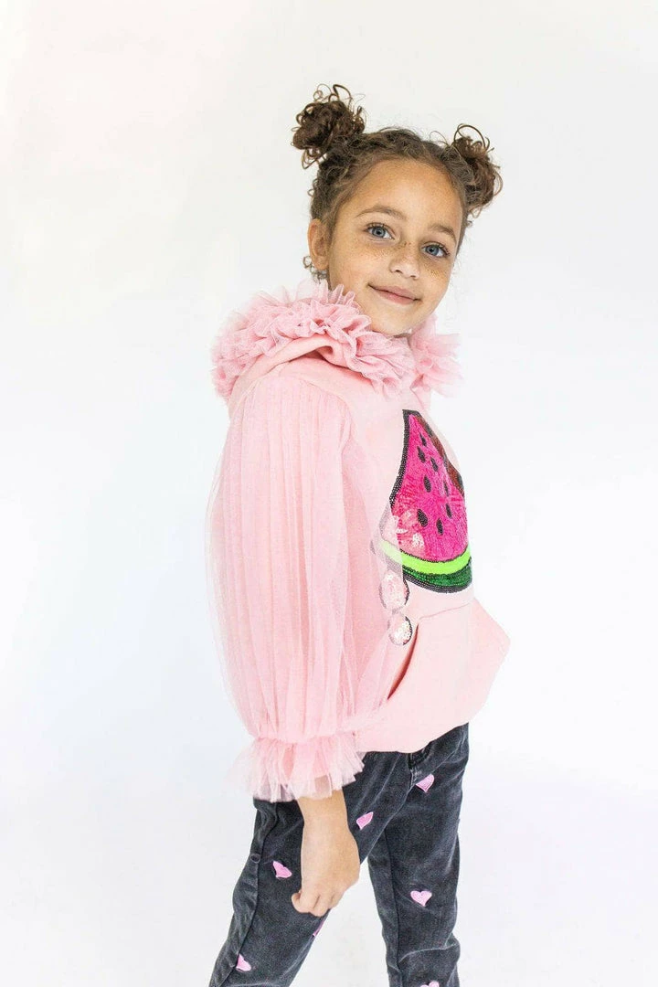 Pink hoodie with sequin watermelon slice with tulle detail on arms and hood!